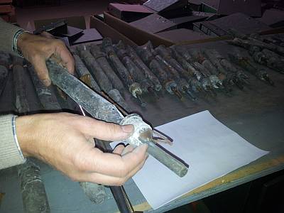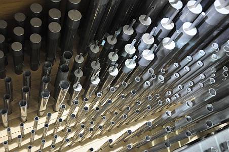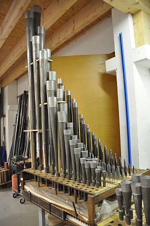 Im Lagerbereich werden viele verschiedene Typen von gebrauchten Orgelpfeifen gelagert, die für eine spätere Restaurierung aufgehoben werden.