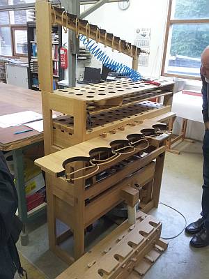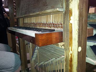 Die unten abgebildete Orgel wird momentan restauriert und ist bereits bespielbar. Da das Gehäuse noch nicht vollständig geschlossen ist, sind die mechanischen Abläufe beim Spielen nachvollziehbar. Nebenan werden Figuren eines Instruments bearbeitet.